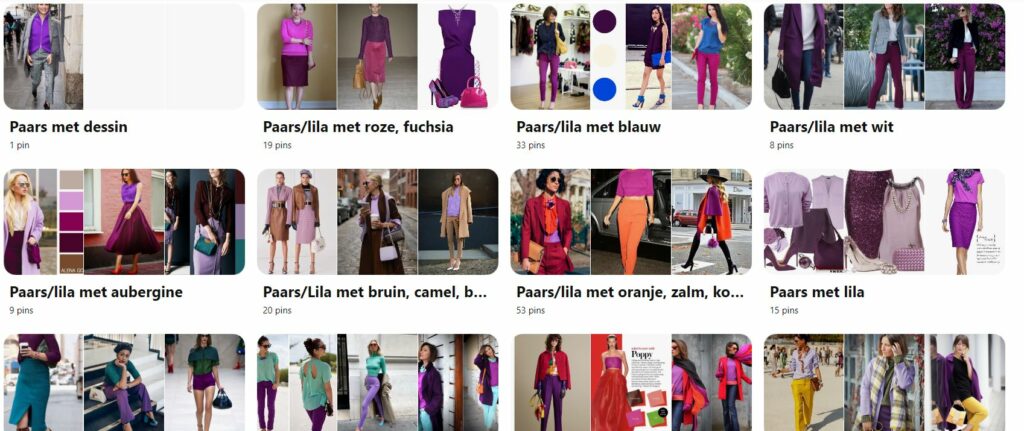 Je hoeft het echt niet allemaal zelf te verzinnen. Natuurlijk kun je aan de slag gaan door te experimenteren, maar kijk ook vooral hoe andere mensen het doen. Kijk gerust de kunst af van modeontwerpers, filmsterren, idolen of magazines en kijk welke prachtige kleurcombinaties zij maken. Haal daar jouw inspiratie vandaan. Een heel goed middel om plaatjes te verzamelen is bijvoorbeeld Pinterest. Daar haal ik ook veel inspiratie vandaan. Één waarschuwing is wel op zijn plaats, het werkt wel verslavend. In ieder geval kun je op mijn Pinterestborden genoeg voorbeelden vinden van kleuren combineren in kleding.